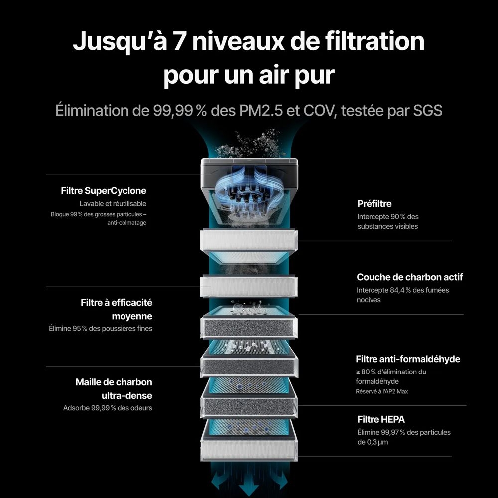 Doté d’un système de filtration en 7 couches incluant un filtre spécifique au formaldéhyde, le Purificateur SafetyPro AP2 Max offre une capacité de purification renforcée. Sa capacité de filtrage est augmentée grâce à un système de cyclone amélioré et un volume de filtre jusqu’à 4 fois supérieur, ce qui prolonge notablement la durée de vie des filtres.